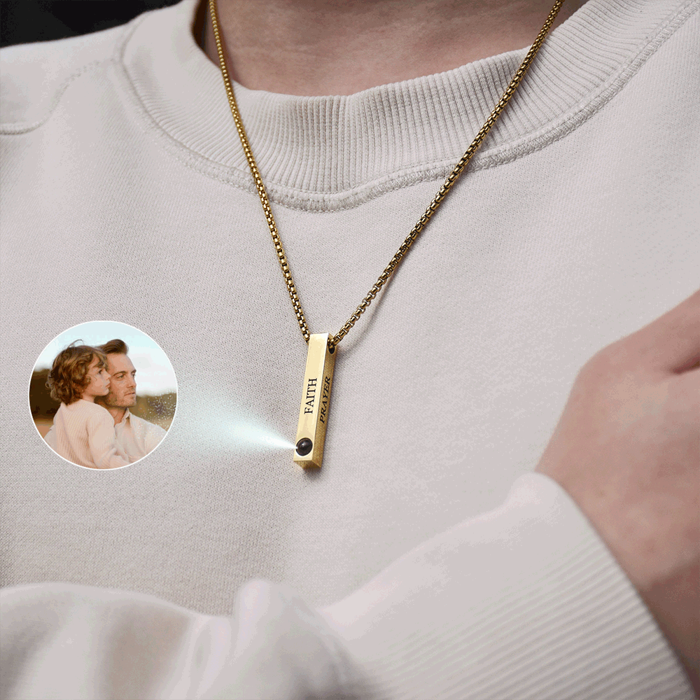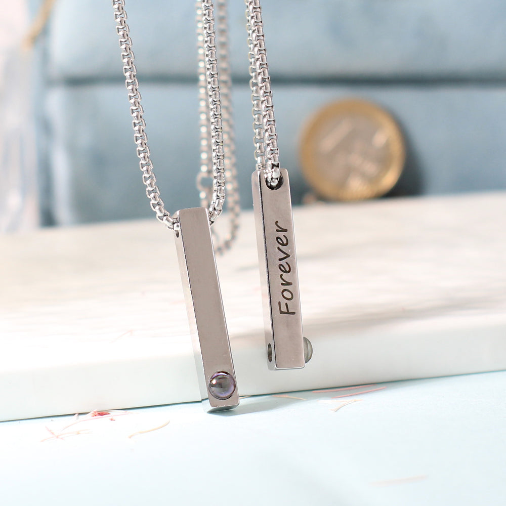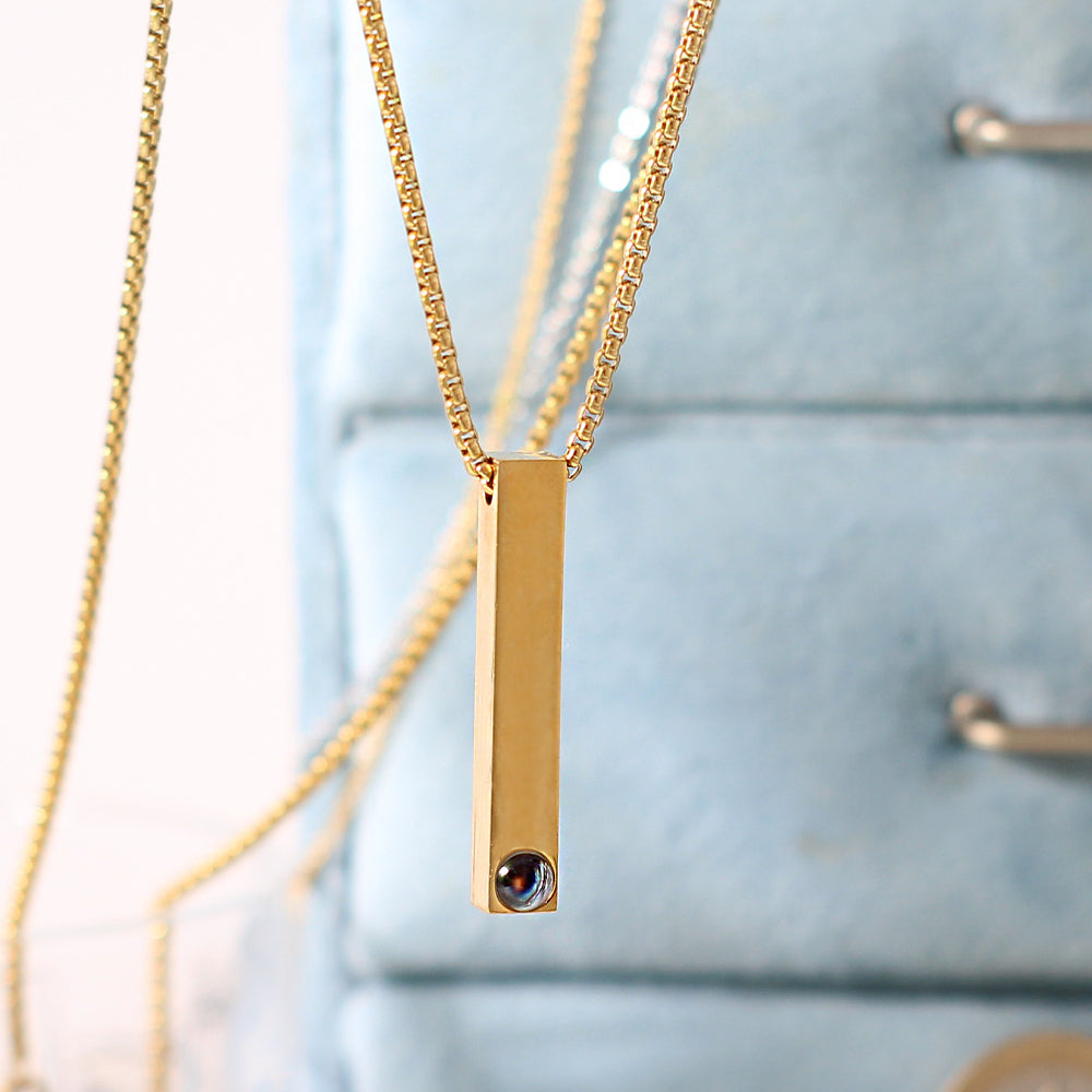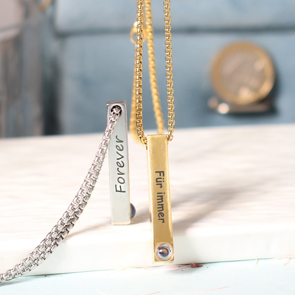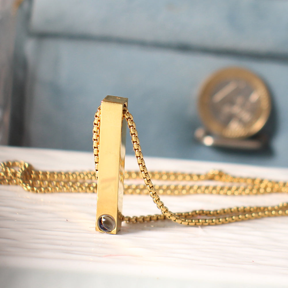 Der schlanke, rechteckige Anhänger enthält ein personalisiertes Foto im Projektionsstein – sichtbar mit Licht oder Smartphone.